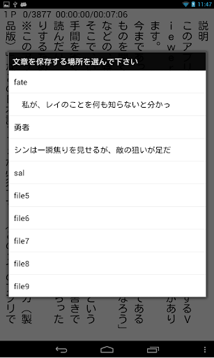 「文章保存」・・・保存数は10に設定しております。保存したい場所をタップすると文章名の入力画面が現れます。ここに好きなタイトルを入れて「OK」をタップすると保存されます。もし、何も入力しないまま「OK」をタップすると、表示されているページの頭から20文字がタイトルになります。文章保存には、同時に栞を挟む機能もありますので、表示されているページが記憶されます。ただし、読上げている文の頭ではなく、ページの頭に栞がはさまります。