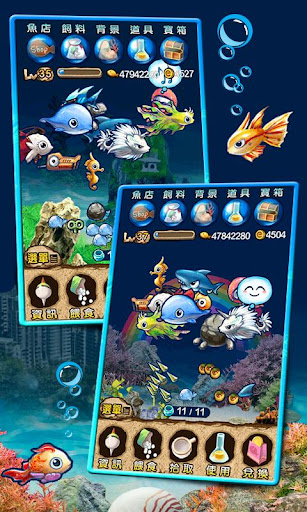 好好照顧你的魚兒,如果你的魚魚肚子餓了,會變成綠色的,這時候記得點選飼料餵食他!魚種除了有一般常見的金魚、小丑魚、娃娃魚等,還有多種例如仙女魚、機器魚、章魚燒、古代龜、太陽魚等多種獨特魚魚!你的魚魚會定時生産寶物,賣出寶物來賺取魚幣購買更多東西。當玩家收集到特定的寶物之後,還可以兌換最神秘的傳奇魚種!