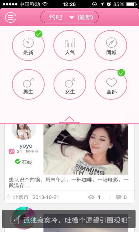 约吧是一款以愿望为主题的移动社交应用。一个人的力量是有限的,让大家来帮你,让梦想更近更真实。听听Ta的声音,看看Ta的梦想。爱,需要传递,需要沟通,才能生生不息,用你的心,感受别人的梦。这里有好玩又有意义的活动,有一群怀揣着梦想和爱心的人,快来成为这里的一员,认识新朋友,特色的语音签名,展现不一样的你,发文字、照片、语音、表情……随心所欲的畅聊,分享随时随地——定位分享,同步微博,一切就是如此简单,约吧广场把我们聚在一起,爱就大胆说出来吧,让所有人知道