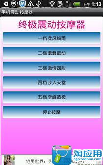 根据传统的“九浅一深”方法研制,一共有5个档次可以调节每档陪文字说明,画面简洁,容易操作,使用简单方便,可以按摩很多地方,肩膀,颈部,还有......大家都懂的。