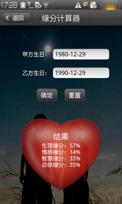 2个人之间究竟有多少机缘?发生在2人之间的种种事情如何得到解释?[缘分测算]也许能够帮到您。[缘分测算]软件从时间生物学的角度解释了人与人之间的机缘关系,包括生理缘分、情感缘分及智慧缘分,用百分制来定量描述缘分的大小,最低为0,最高为100%,指数越高表明2人之间的相容性越好,缘分越强,发生联系的可能性也越大。
