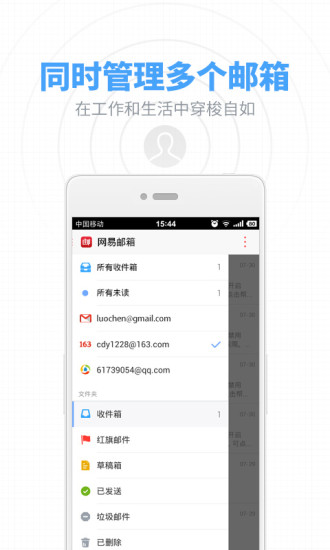 网易邮箱官方应用,品质保证,6.8亿用户的邮箱首选。★国内最高级别的邮件系统安全认证★支持添加QQ、Gmail、139、Hotmail、新浪等其它邮箱【支持所有邮箱】- 支持网易163、 126、 Yeah 、VIP、 企业邮箱。-支持添加QQ、Gmail、139、hotmail、新浪等其它邮箱。【最高安全认证】 - 数据安全:本地数据加密,支持手机通讯录云备份。- 隐私安全:可添加手势密码,加强保护你的邮箱隐私。【省流量】- 邮件智能收取技术,降低流量损耗。- 「零流量」附件转发。【更贴心】- 独享网易官方新邮件实时推送,安卓手机上最快的新邮件提醒。- 完美适配各类平板,支持横屏操作。【联系网易邮箱手机版团队】直接发邮件到mailapp@service.netease.com,我们无比期待你的声音。官网:http://app.mail.163.com