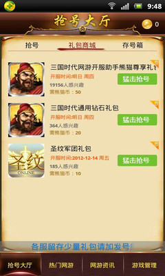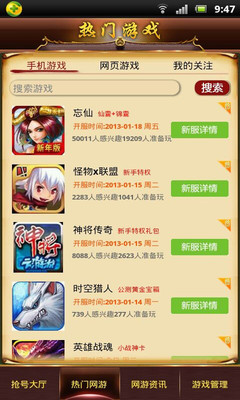 产品功能:建立网页游戏开服时间、最新手机网游搜索、网页游戏、互通游戏最新排行搜索、抢号大厅可以领取独家游戏大礼包。游戏关注闹钟等时间定时队列。游戏队列时间到后手机左上角会出现游戏闹钟提醒图标并配有类似手机短信的声音和震动提醒。