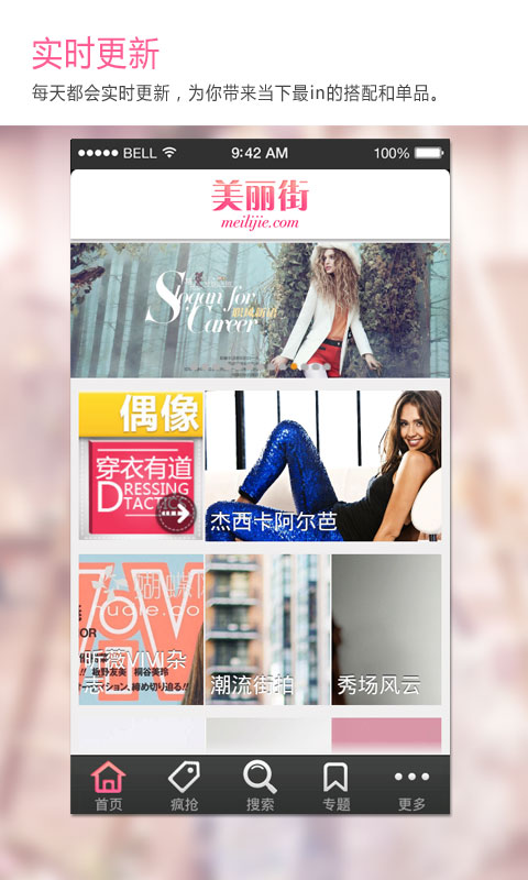 美丽街是一款为爱美爱淘的女孩精心打造的时尚应用;汇集了千万款精挑细选的搭配和单品,从多种时尚维度分类展示;在这里可以让你轻松掌握当红明星达人的穿衣之道,也可以让你轻松玩转性感、优雅、森女等当下流行的各种风,各种范!!