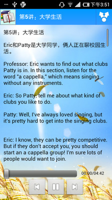 本应用包含美语三级跳的全部高级教程,一共24课,每课都配有文章显示,以及相应的音频广播,边听边看,绝对是您学习英语的最佳帮手。