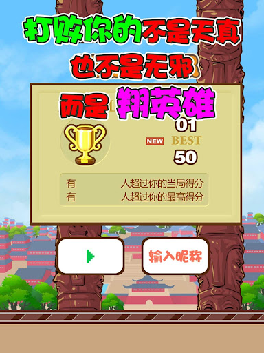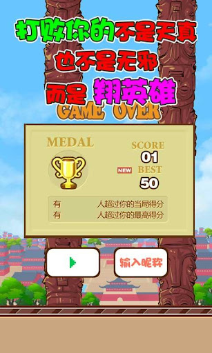 英文名《FlappyHero》又名“飞翔的英雄”。在游戏中,你将化身为一名初出茅庐的”蹩脚大侠”与世界各路高手一起挑战盘龙柱林,凭借SHI一般的轻功夺取“天下(跳柱)第一”的荣光。当比赛开始成千上万英雄向前飞翔时,还真有种急着去投胎的赶脚,几秒过后哀鸿遍野。