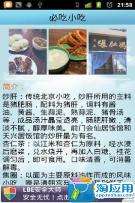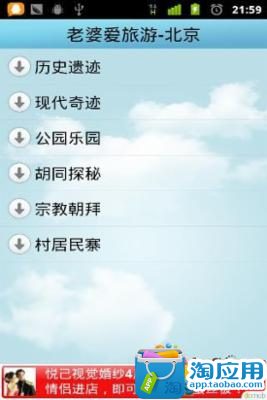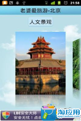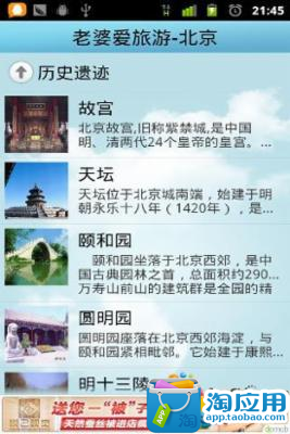 一款精简的北京旅游景点介绍,精心收集将近100个北京旅游景点,涉及到人文,自然,奥运,饮食,购物,每篇都有详细的景点介绍,精美的景点图片和实用的门票和交通信息,以及贴心的小备注。让您在北京不再盲目。提前规划您的行程,从容游览帝都!