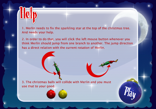 聖誕叢林大冒險是一款冒險類游戲。聖誕老人需要修好在聖誕樹最頂端的星星燈。他需要你的幫助。為了幫助他,你將要在你認為聖誕老人應該從這根樹枝跳向另一根樹枝的時候點擊屏幕。跳躍的方向和聖誕老人當前的旋轉方向有密切聯繫。聖誕球會碰撞聖誕老人,所以你必須利用它們來幫助自己。加油!