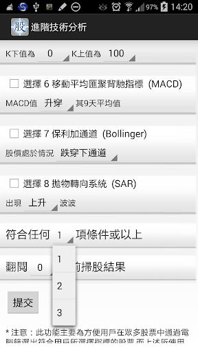 全功能掃股,指標包括:9天升穿/跌破20天EMA、10天升穿/跌破20天SMA、K位處範圍、K 值升穿/跌破D值、RSI 位處範圍、SAR 上升/下跌訊號、MACD正負值等,而且本版本亦提供混合篩選模式,更方便捕捉目標股票。 本版本提供20個我的組合。任何3個混合篩選指標,可翻閱最多10天前掃股資料。