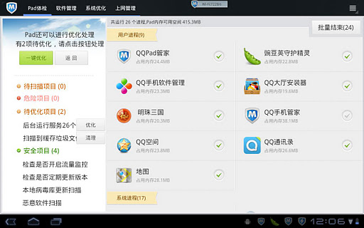 腾讯Pad管家由手机管家团队精心打造,适配android平台3.0以上系统。