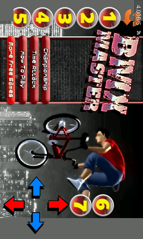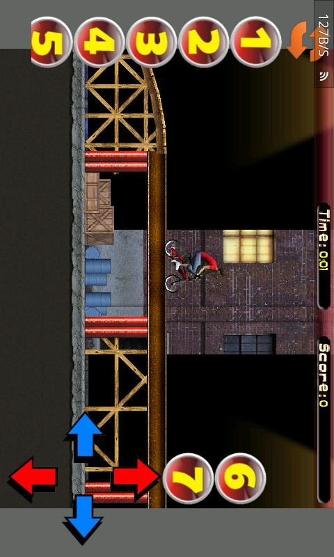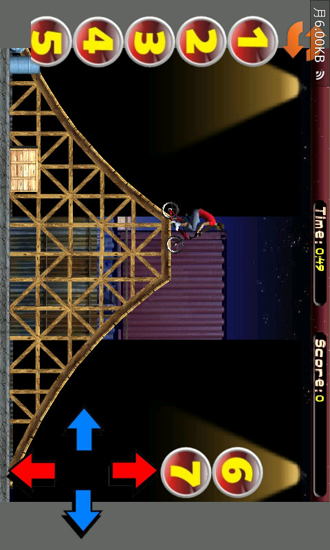 游戏中你是一名自行车越野赛中的精英赛手,要以尽量快的速度平稳地行驶在赛道上。当然,赛道不是一马平川的,会有各种各样的崎岖地形。屏幕右下角,向上和向下的箭头分别代表自行车向前和向后行驶;向左和向右的箭头分别控制自行车的后轮和前轮,使之保持平衡。相信大家都是精英,一起来体验吧。