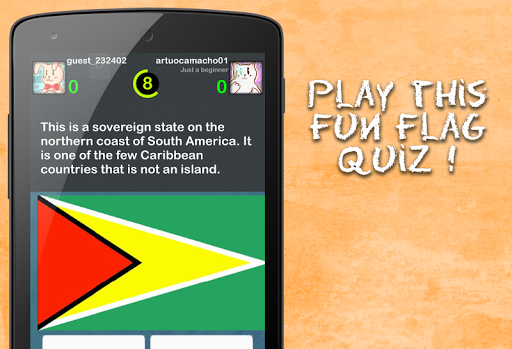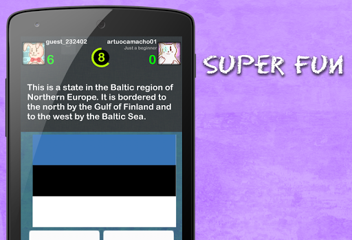 的目的,這種樂趣問答游戲,名稱是您的對手前旗的正確。 你可以在聯合國旗幟下,美國名字嗎? 每一個問答輪你將會給七個標志。 打贏你要想在船旗的正確名稱。 你可以更快的答覆是正確的話,你將會賺取更多點。 的人,年底的最高分數的問答輪勝!