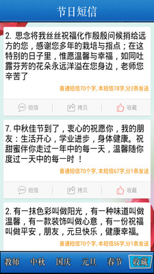 1. 节日短信囊括了中国传统重要节日(教师节、中秋节、国庆节、元旦、春节等)的祝福语. 2. 用户可以很方便的根据节日查找祝福语, 可以直接发送祝福语给好友亦可以复制祝福语到粘贴板. 3. 对于喜欢的祝福语可以集中收藏起来方便下次再使用