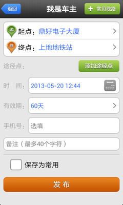 一个免费的拼车软件。看地图,找拼车。地图上直观显示对方位置信息和线路信息,拼车更简单。如对方留有电话则可直接拨打电话联系,也可以迅速发送拼车请求,系统将自动发邮件或短信通知对方。发布线路时可拖动地图选择地点,非常方便。支持QQ号登录。