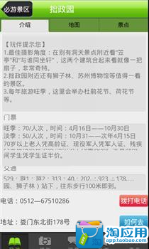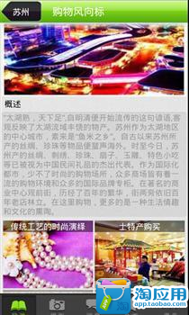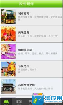 俗语有云“上有天堂,下有苏杭”,而苏州“风物雄丽为东南冠”,享有“苏州园林甲天下”的美誉,再加上2500多年的人文历史,苏州素来是人文底蕴浓厚的旅游胜地。游览苏州,你必定需要一个熟悉苏州的本地导游,让“苏州智慧游”来做你的私人导游,带你玩转美丽苏州。 苏州智慧游是什幺? 苏州智慧游是基于智能手机的导游软件,是自助旅游最佳伴侣。 她是景区导游 虎丘、寒山寺、拙政园、狮子林、留园等园林景点,她如数家珍; 为你讲解原汁原味的景点故事,让你移步换景,带你品味景区的人文历史; 为你规划游玩的最佳路线,让你省时省力全面玩转景区。 她是本地向导 带你穿梭于苏州的大街小巷,吃遍苏州特色美食; 向你推荐苏州特色旅游线路,深度体验苏州文化,骑游、驾游、船游、夜游、24小时游、节庆游,总有适合你的范儿; 去哪儿,怎幺走?她一键索引,为你轻松指路; 想买苏州特产?她让你购物价廉物美。 她是私人秘书 苏州旅程很精彩,要与朋友分享?她会帮你把你的所见所闻所想分享给微博好友。