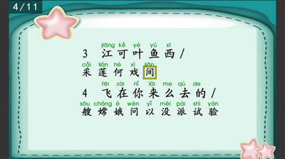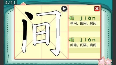 使用方法:点中页面的空白处(非汉字处),会出现菜单栏。菜单栏上,点左右箭头,可翻页;点朗读,可读出页面上的句子;点播放,可自动逐页播放。点中页面上的汉字,会弹出该字的信息框,包括汉字的拼音、词组,以及一笔一画的动态书写。