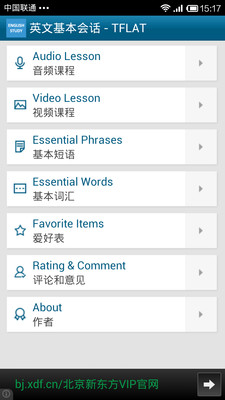 Android 最好免费学习英文的软件。这软件包括从基本到高级的会话, 并有发音与翻译。