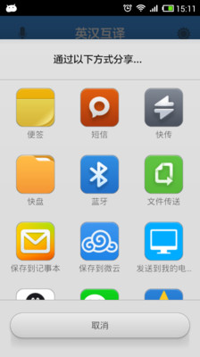 软件采用清爽的界面,采用有道、百度翻译引擎,实现了中英文之间的在线互译操作,支持语音输入功能并提供了复制翻译结果和分享翻译结果的功能