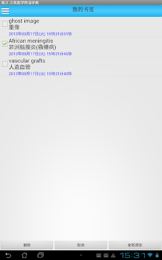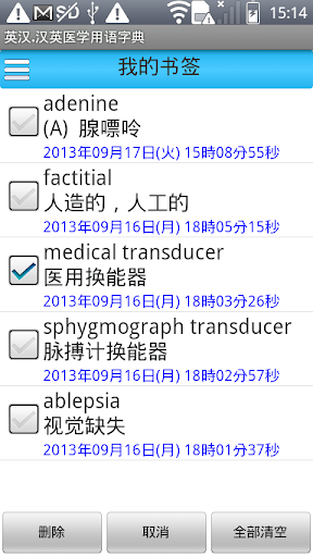 在详细画面菜单,可把重要的词汇加入书签,所用在详细画面参照过的单词都会被自动加入历史记录。