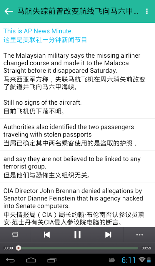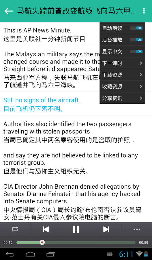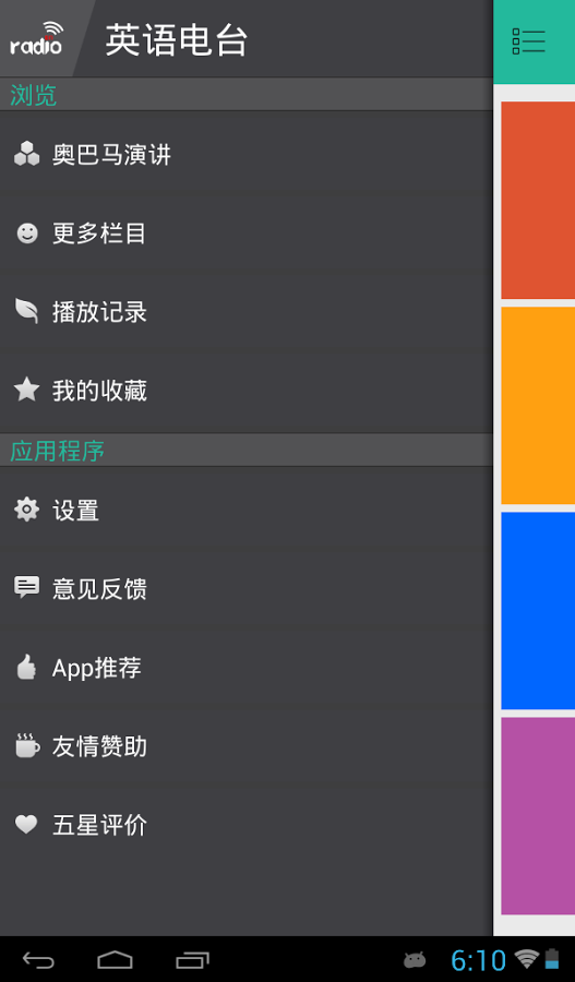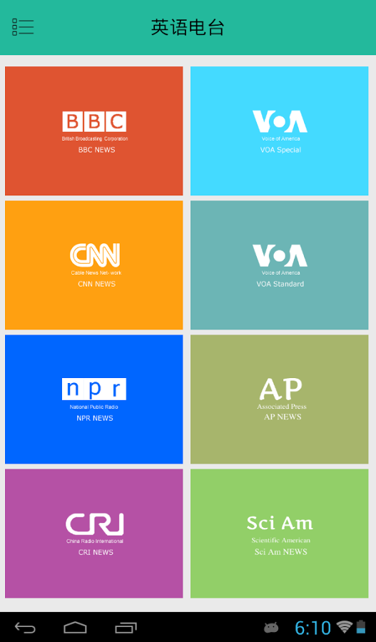 英语电台收集了奥巴马每周电视讲话,自热百科,走遍美国,时差N小时,有声新闻,演讲比赛,励志演讲,明星访谈,经典诗词,经济学人,美文欣赏,VOA常速,VOA慢速,BBC,CNN,NPR,CRI,APNews,科学美国人,自然科学,有声新闻,小故事,脑筋转转转等双语新闻信息。全部的广播信息均带LRC或TXT字幕,练习英语听力利器,同时还可以了解国内外时事新闻。每天都更新全部栏目新闻信息,并且能够提醒能收听最新的资讯!