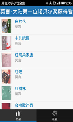 目前小米市场最好最全的莫言电子出版物。收录了莫言所有的已经面世的作品。《生死疲劳》《蛙》《红高粱家族》《丰乳肥臀》《檀香刑》《莫言中短篇小说散文选》《酒国》《食草家族》《老枪宝刀》《酒神》《会唱歌的强》《四十一炮》《天堂蒜薹之歌》《红蝗》《红树林》《透明的红萝卜》《战友重逢》《白棉花》《中州纪事》《师傅越来越幽默》《牛》《莫言中短篇小说散文选》