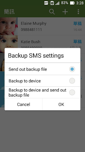 - 備份與回存簡訊:更換手機或需要重新安裝手機時,不想遺失您的重要簡訊嗎?華碩 ZenUI 簡訊提供您更貼心的簡訊備份回存功能,可將簡訊備份儲存至手機中或以電子郵件寄出,讓您的簡訊記錄完整保存!