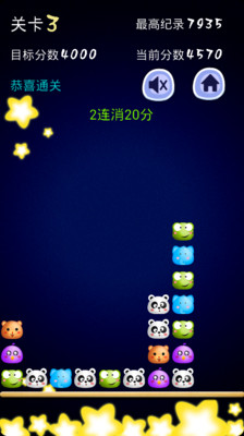 玩法:游戏很简单,无需学习,自然上手。只要找出连续2个或2个以上相同的萌宠手拉手排在一起,就可以点击他们进行消除了。游戏没有时间限制,但是每一关有目标分数。