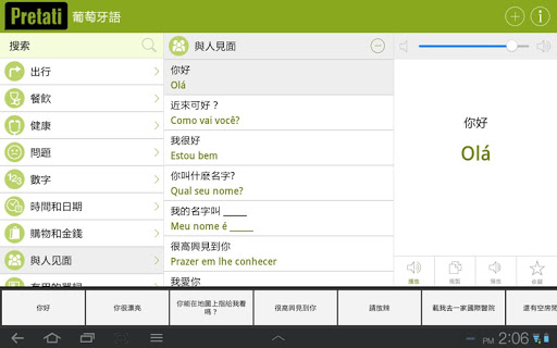 不管你是外國旅遊者,還是葡萄牙語愛好者,Pretati葡萄牙語詞典都絕對會讓你眼前為之一亮。這款翻譯軟件有著超過500條日常用語,并分門別類成10個不同種類:基本資料、旅遊、餐飲、健康、問題、號碼、時間與日期、購物與金錢、與人會面。一些有用的單詞也囊括其中。