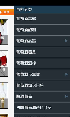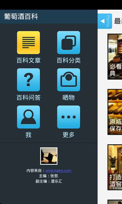 葡萄酒百科android版,是一位随时跟在您身边的品酒师。普及关于葡萄酒的基础知识,由专业品酒师撰稿,教您学会认识葡萄酒,也成为一个品酒师。