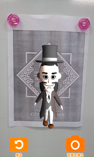 アプリを起動して、イベント開催地にいくつか存在するマーカーにかざすと、大久保利通を2次元化したキャラクタがマーカ上に現れます。