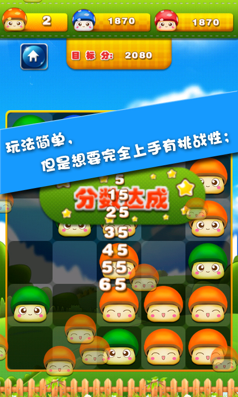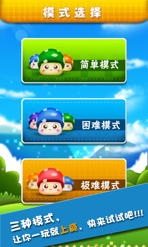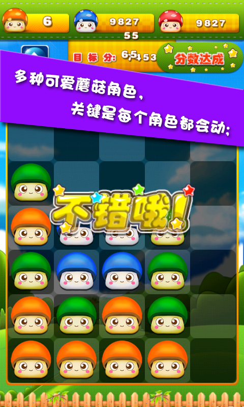 你还在玩传统的对对碰、连连看吗?你还在玩水果消除、糖果粉碎传奇吗?那么你可能不知道最近蘑菇消除很受欢迎!!!蘑菇爆破,打破传统三消游戏,新玩法,等你加入!!!游戏特色:1、多种可爱蘑菇角色,关键是每个角色都会动;2、可爱而又时尚的梦幻游戏画面;3、超流畅的游戏体验,高中低端手机均可使用;4、玩法简单,但是想要完全上手有挑战性;玩法很简单:1、不同于小鸟爆破,蘑菇爆破和碰碰猫一样两个及以上的蘑菇即可消除;2、时间模式不同于找茬、找你妹等游戏,设置时间考验,需在规定时间内达到分数;3、同时消灭的蘑菇越多,获得的分数就会越多;