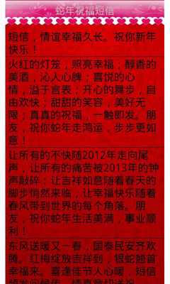 蛇年拜年短信为大家提供一个简单明了的短信拜年发送通道,在这里你可以找到你所需要的节日祝福短信,短信专注于节日短信的收集于整理,我们相信只有专注才有能达到更好的祝福!