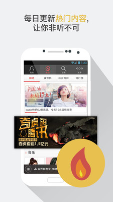 ★ 十三种分类:新闻、音乐、小说、情感、综艺、明星娱乐、英语、相声曲艺、军事历史、财经、科技、教育、健康生活一网打尽,总有一款是你的爱!