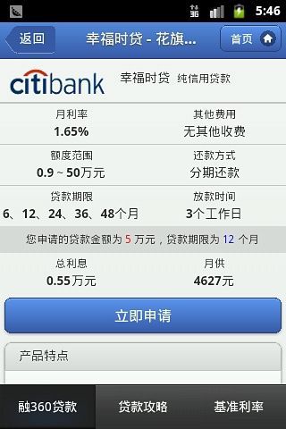 【融360贷款 — 随时随地免费申请银行贷款】 融360贷款APP免费为您提供数百家银行等贷款机构的贷款产品信息;包括信用贷款,抵押贷款产品的搜索比较服务,帮助您迅速找到合适、高质量的贷款,并免费获取银行信贷员联系方式,在线直接申请贷款。