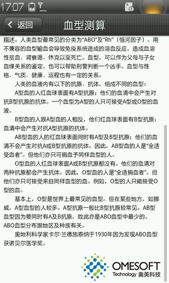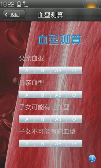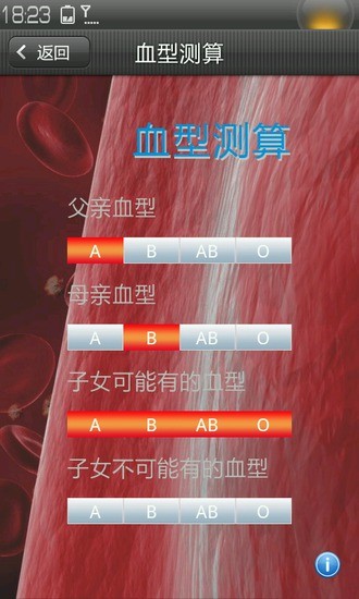 血型是针对每个人血液内红血球细胞表面各有不同物质的描述人类血型最常见的分类为ABO及Rh(恒河因子)用不兼容的血型输血会导致免疫系统造成的溶血反应,造成血溶性贫血、肾衰竭、休克以至死亡血型,可以作为父母与子女血缘关系的鉴定,也可以帮助刑警判断一个凶手血型与性格、气质、健康、运程也有一定的关系本程序能够根据父母血型准确推测子女可能出现的血型,并排除绝对不可能出现的血型