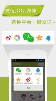 表情管家是一款手机表情管理软件,收集了时下最为流行的网络动态表情:阿狸、炮炮兵、兔斯基、网络流行语、鱼妹兔……,让你在手机上也能使用各种动态表情。目前己支持发送至微信、QQ、朋友圈、新浪微博、腾讯微博、人人网等主流平台。