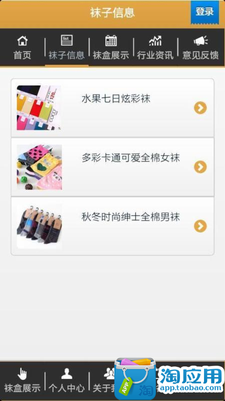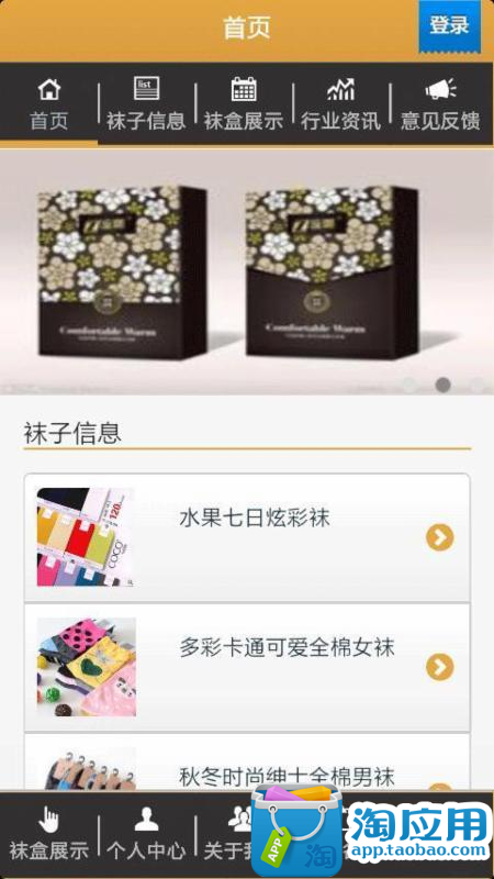 1、首页:为您提供快捷导航使用应用 2、袜子信息:为您展示各种款式袜子信息 3、袜盒展示:为您展示各种袜盒信息 4、行业信息:为您提供行业最新的信息 5、意见反馈:欢迎提出您的宝贵意见