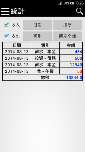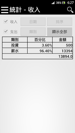 統計總表內可以看到所有的收入和支出,還可以依照自己的需求做出各種篩選類別。