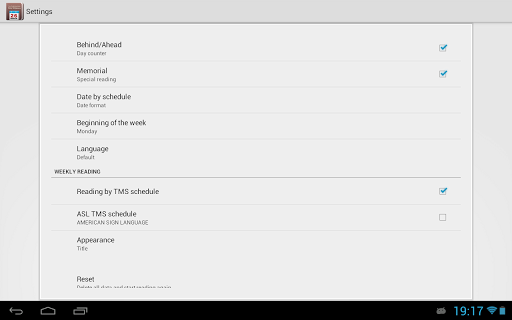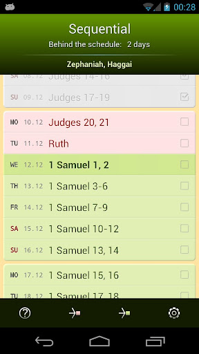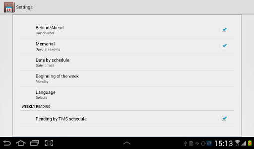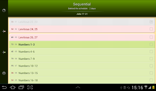 本應用程式讓你可以隨時查看你的讀經進度,看看是否落後或超前了。它也包含了每週傳道訓練班課程表的閱讀經文。