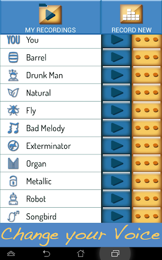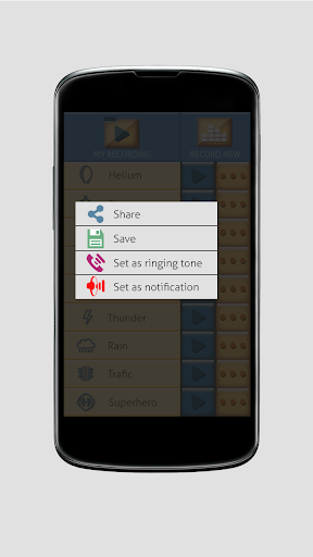 變聲效果是簡單易用。按下一個按鈕,並採用特殊效果來修改你的錄音。記錄自己,或者使用舊的錄音在您的手機,應用有趣的效果,聽新的錄音並保存有趣的聲音。有了這個聲音編輯器,你可以在你的手機上操控錄音。選擇從庫很酷的音效,將其保存,並將它們設置為短信鈴聲,來電鈴聲和鬧鐘的聲音。改變並創造許多不同的聲音,並發送惡作劇錄音給你的朋友或在社交網絡分享。