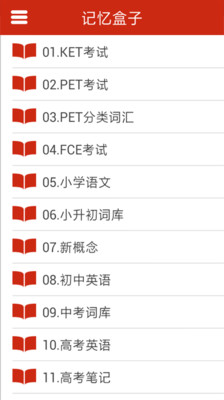 目前记忆内容涵盖KET、PET、FCE、文学常识、古诗词、小升初英语、中考英语、新概念、各类专业考试等领域