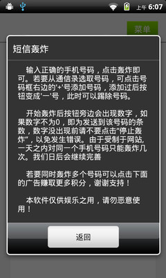 是否常常受到陌生来电的骚扰,被响一声是不是很烦,被发送诈骗信息是不是很恼火,现在可以用诈骗短信克星--炸死你啦!只要输入号码即可免费轰炸,该软件利用互联网短信接口,不会泄漏你的手机号码,不会产生一毛钱信息费,请放心大胆的使用!