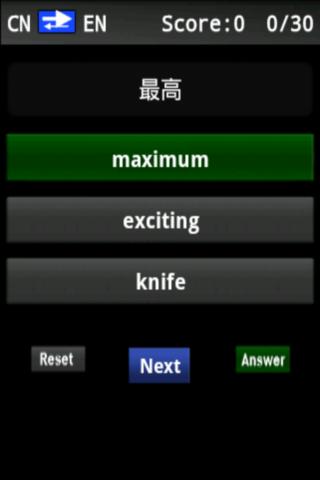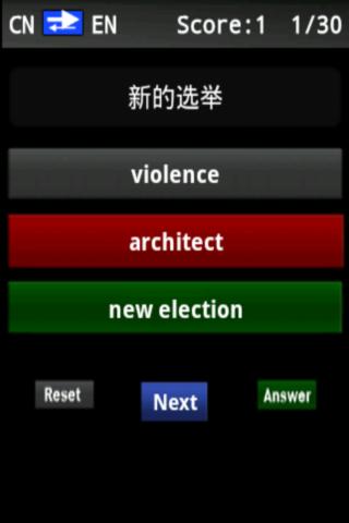 有了这个易于使用的应用中你可以提高你的英语或中文能力随时随地!如果你的选择是正确的,按钮会亮起绿色。如果你错了,它会变成红色。