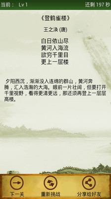 诗词消消看是一款超级好玩,寓教于乐的文字益智游戏,你只要在一堆打乱的文字方块里按顺序选出每一句诗的文字,这些方块就会消除.界面清晰,操作容易,耐玩有趣,它绝对是你闲暇时候的好伴侣.