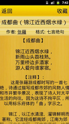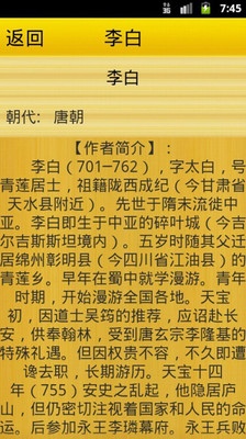 诗词应用,个人写的较完整的应用,内含有5000首左右的从先秦到当代的诗歌和作者介绍。兼容android1.5以上的系统