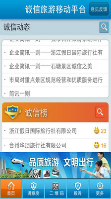 “诚信旅游移动平台”是由台州市旅游质量监督管理所委托台州金苹果公司开发的一款手机客户端软件。用户下载安装后,可以随时通过扫描旅游企业二维码,查询该企业的基本情况,诚信度信息,对该企业所提供的产品服务进行满意度评价,或即时在手机客户端上对该企业进行消费投诉等。目前,公测软件还存在着很多不足和缺陷,欢迎您在使用过程中及时反馈建议,以便我们及时修正,更好的为用户服务。