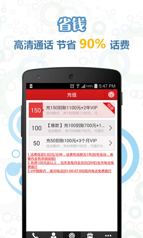 话通省钱电话,千万用户最信赖省钱通话软件。通话流畅,音质清晰,去电显号/隐藏号码随心所欲,会员日、夜间电话无限制免费打,还等什么,下载免费拿话费吧!