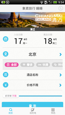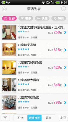 按快捷、奢侈、特价、特色、舒适、青旅等条件查看酒店信息。
