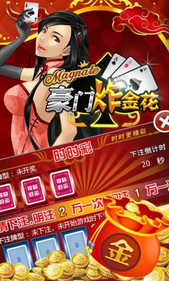 ★炸金花又名赢三张/三张牌、诈金花、金花、扎金花、天天砸金花,全国最火爆最刺激的“豪门赢三张”游戏强势来袭!!!超刺激爽快的游戏体验,海量的奖品,劲爆的赛制,华丽的翻倍。 画面精致,容易上手,挑战你的智慧与运气极限。