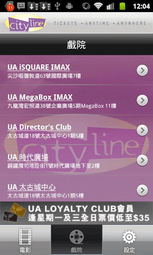 透過「購票通 Cityline」應用程式,您可以即時購買全港UA戲院戲票,無需再受排隊之苦! 本程式提供全線UA戲院電影放映時間、即時座位表、電影介紹及戲院資料等。請即免費下載! (購票服務暫只供購票通會員使用)